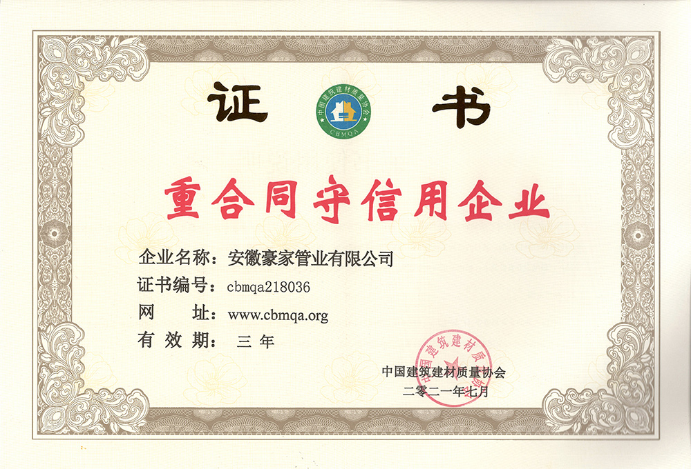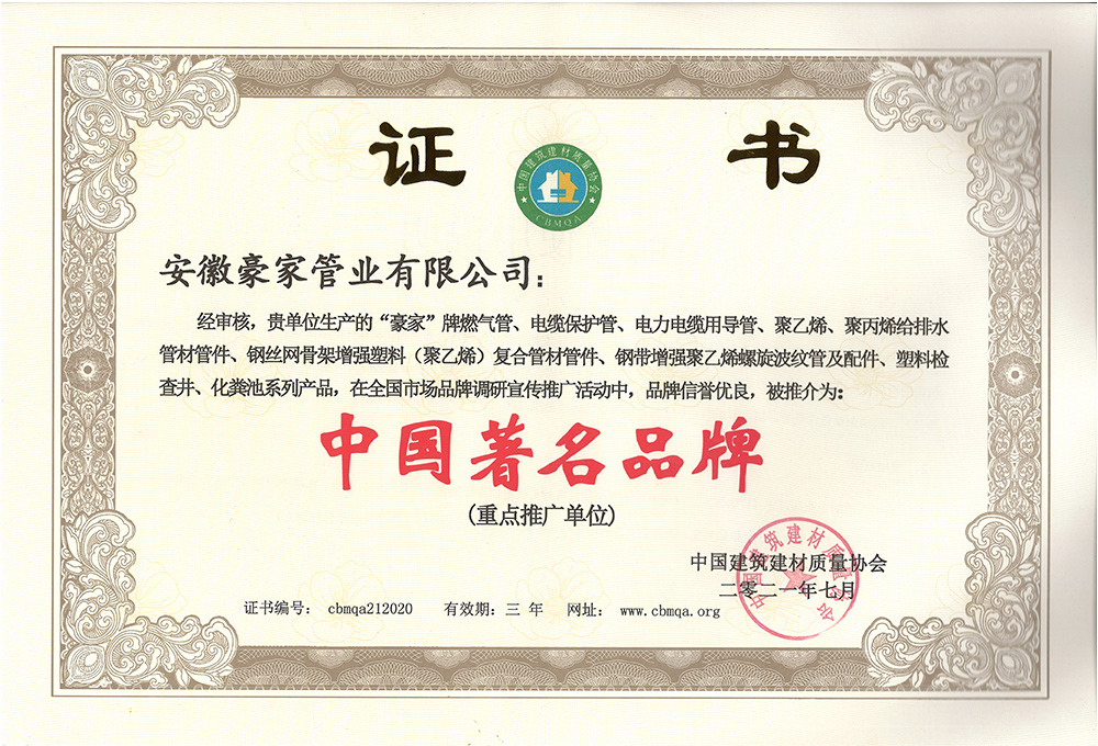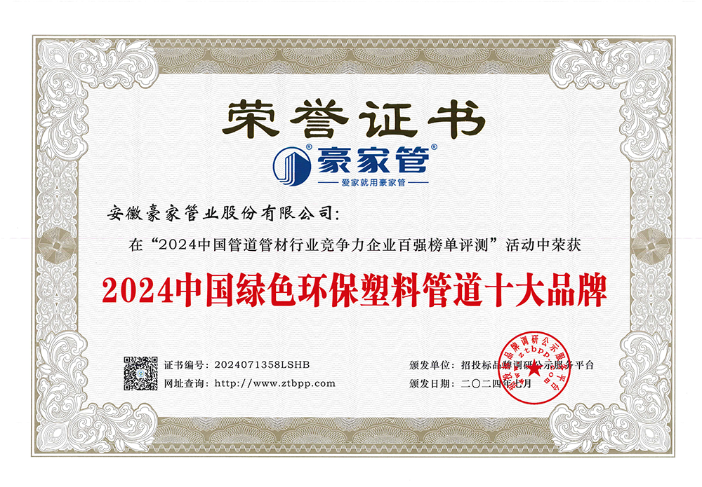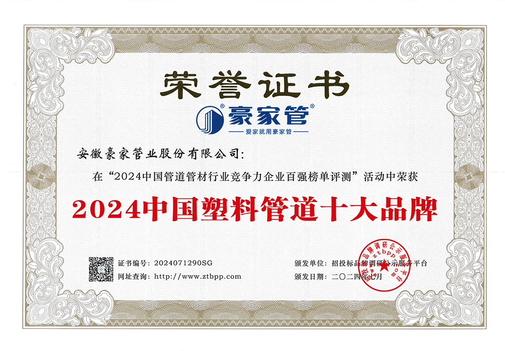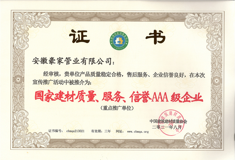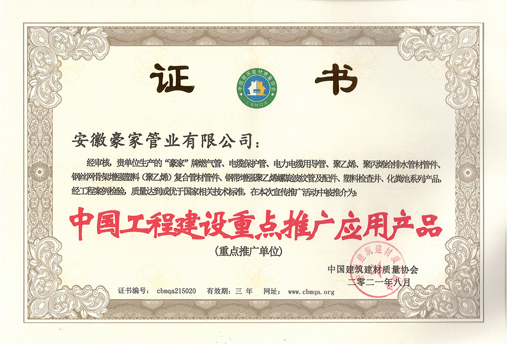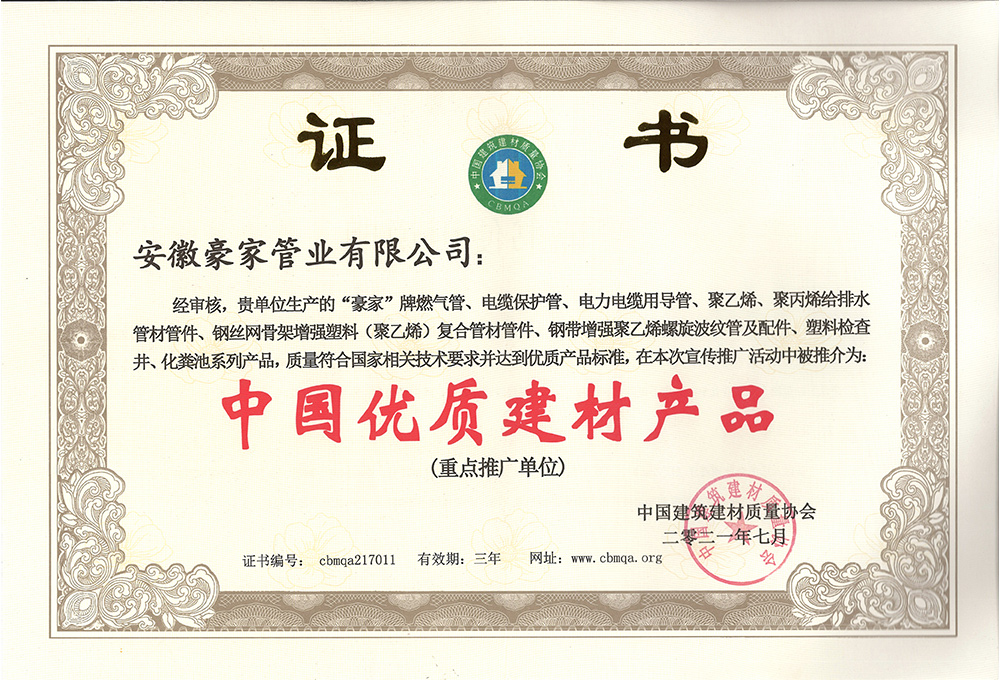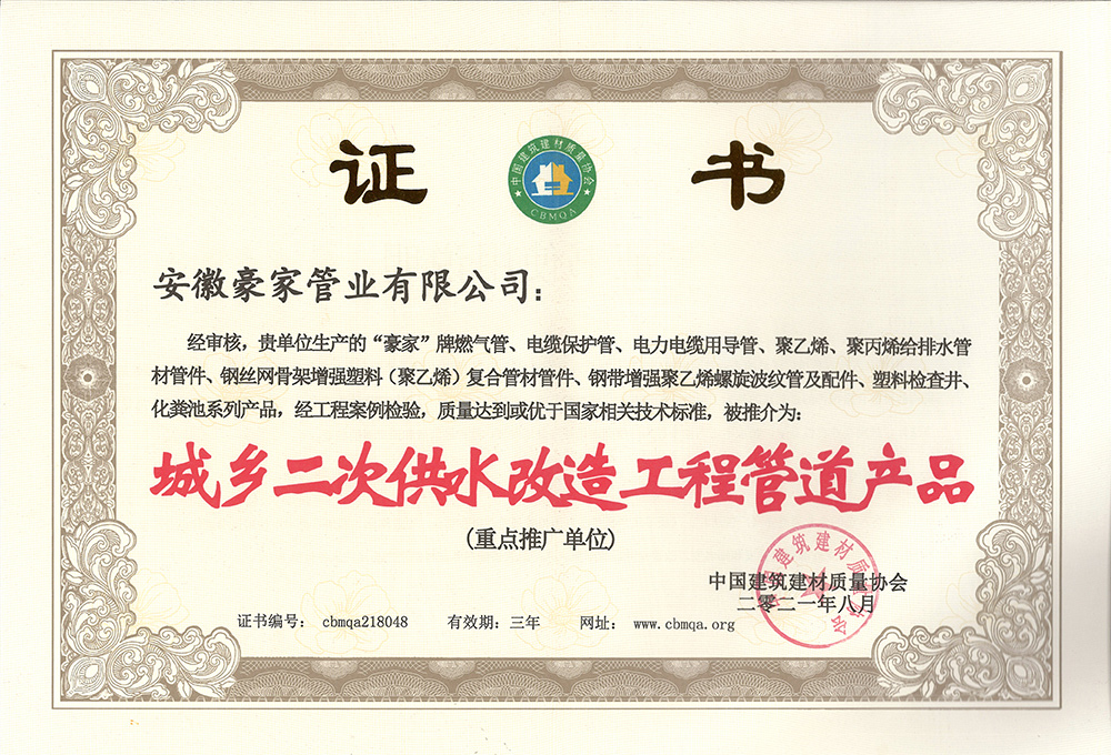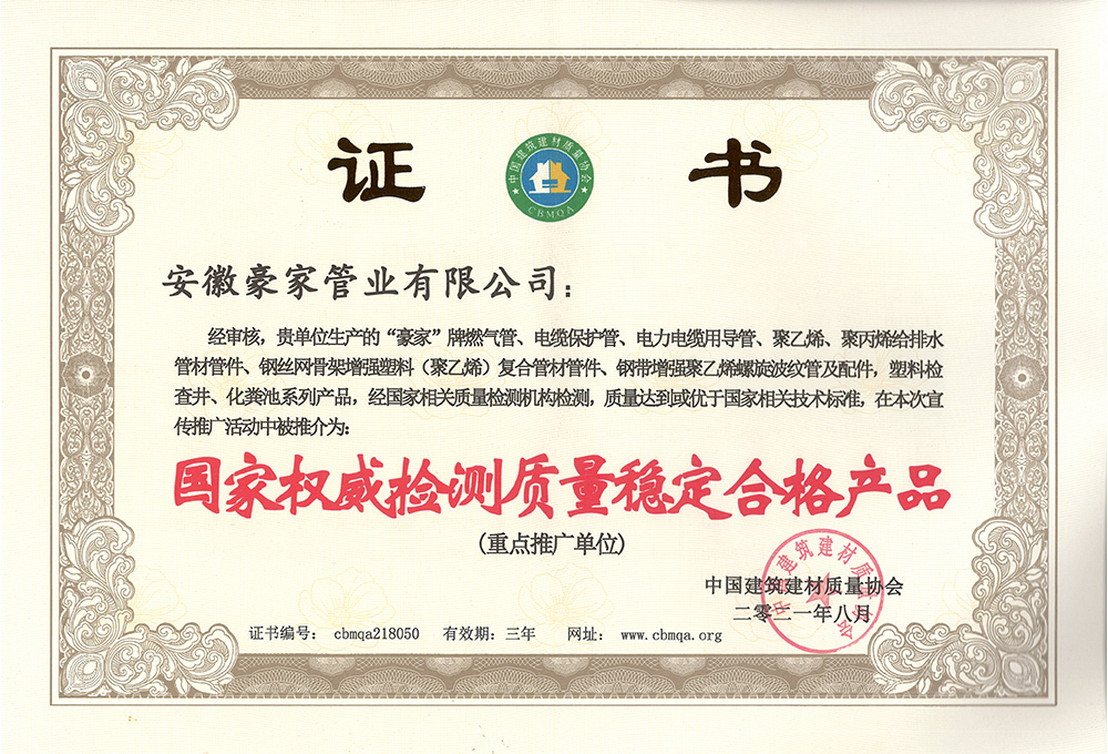 多年來(lái),豪家管業(yè)注重科技研發(fā),秉承“質(zhì)量求生存、信譽(yù)求發(fā)展”發(fā)展理念,產(chǎn)品通過(guò)國(guó)家的檢測(cè)機(jī)構(gòu)檢測(cè),技術(shù)指標(biāo)均高于相關(guān)標(biāo)準(zhǔn),多次參與編寫相關(guān)國(guó)家標(biāo)準(zhǔn)、產(chǎn)品圖集、擁有多項(xiàng)發(fā)明和國(guó)家專利,受到行業(yè)和 市場(chǎng)的廣泛認(rèn)可,也斬獲眾多榮譽(yù)。